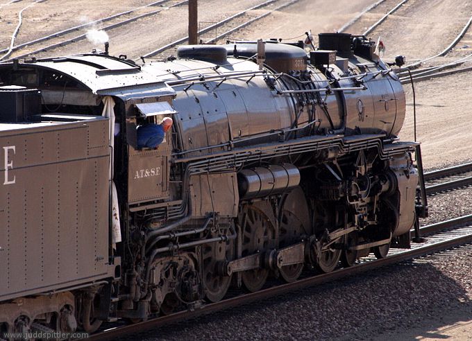 Reflections of sky and hills accompany 3751 into Barstow. This shot, along with some of the others taken from the dark side of the locomotive, required adjustments in photo-editing software to brighten the otherwise heavily shadowed side of the train. August 26, 2002, 3:24 PM |