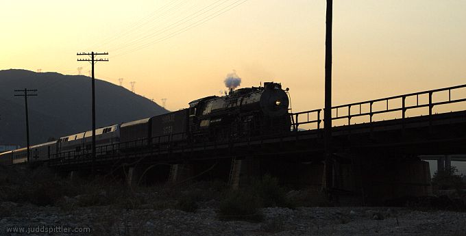 ATSF 3751 crosses the wash at Devore, at the base of Cajon Pass. The steam visible is from the locomotive's whistle.