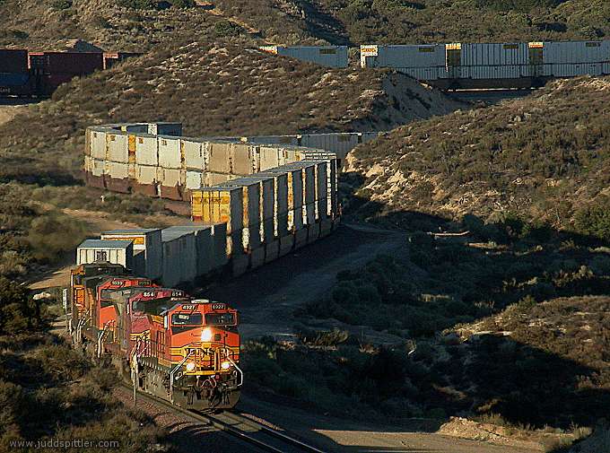 A double-stack train comes down track 2 while another goes up track 1. Track number 2 (the more southern of the two BNSF tracks) is most often used for traffic coming downhill toward San Bernardino. Track number 1 (which is longer and less steep) is used most often for traffic moving up the hill . June 13, 2002, 7:06 PM |