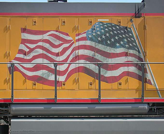 Torn but proud, "Old Glory" accompanies an SD70M, part of a westbound train stopped at the UP Highland siding. The "Highland Station" is adjacent to "Summit" on the BNSF tracks. June 29, 2002, 4:05 PM |