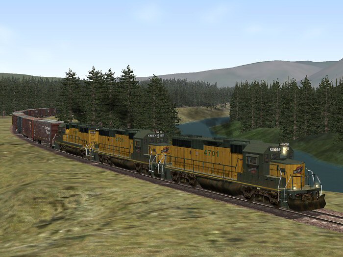 CNW 4701 leads a manifest train along the Middle Fork of the Flathead River east of Belton.